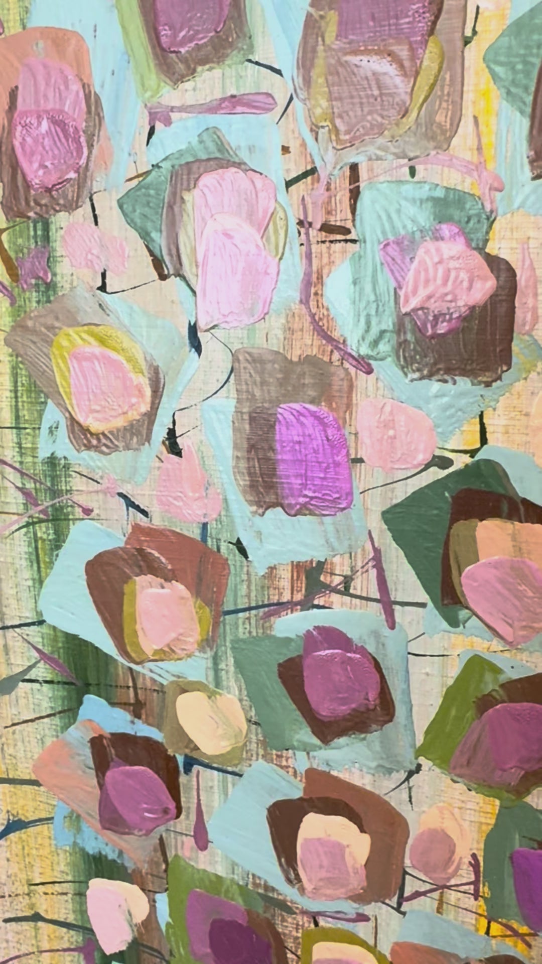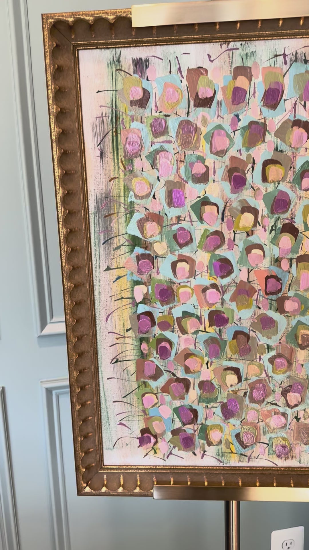 This lively abstract is all about color and movement! This piece adds interest without overwhelming a space, making it perfect for anywhere in your home! Framed in a new beautifully detailed, vintage style frame. The piece measures 27 x 19.5.
