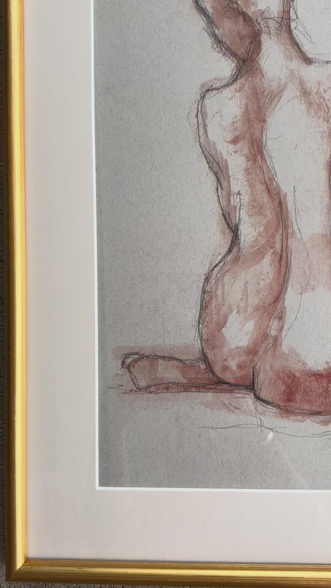 Beautiful figurative sketch by artist Lisa Moore. This piece has a calm, almost daydreamy vibe to it. More sketches this seated figure from behind using loose lines, warm rust colored shading that feels effortless and natural. This piece measures 18 x 15 1/4 inches.
